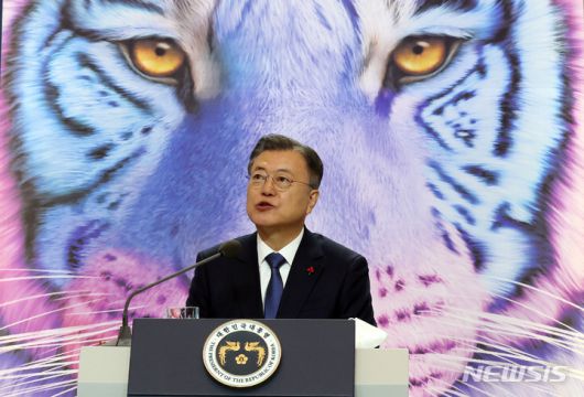 [서울=뉴시스] 전진환 기자 = 문재인 대통령이 3일 오전 청와대에서 화상으로 열린 '2022년 신년 인사회'에서 인사말을 하고 있다. 2022.01.03. amin2@newsis.com |