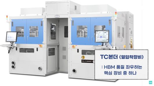 먼저 HBM이 어떻게 만들어지는지 살짝 설명하면, D램이라는 메모리 반도체를 아파트처럼 위로 차곡차곡 쌓는 겁니다. 이게 제조 기술이 상당히 필요해서 아직 삼성도 제대로 해내지 못하고 있잖아요. 이러다 보니까 이걸 만드는 장비가 굉장히 중요합니다. 그 장비를 TC본더라고 부르는데, 붙이는 장비라는 뜻이죠. D램을 위로 쌓아주고, 이걸 열이나 압력을 가해서 붙여주고, 이 과정에서 나노미터 정도의 흐트러짐조차도 있으면 안 되기 때문에 이걸 잡아주는 역할까지 하는 장비입니다.