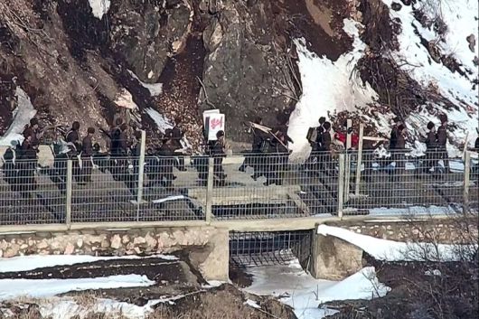 북한군이 서부전선 GP 일대에서 작업 도구와 ‘봉쇄’라는 글자가 적힌 간판을 들고 이동하는 모습. [합참 제공] |