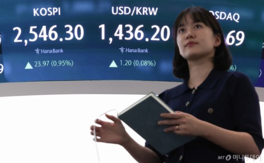 (서울=뉴스1) 허경 기자 = 25일 서울 중구 하나은행 본점 딜링룸 전광판에 코스피지수가 전날 종가와 비교해 23.97포인트(p)(0.95%) 상승한 2546.30을 나타내고 있다. 코스닥는 전날 대비 3.61p(0.50%) 상승한 729.69로 원/달러 환율은 전 거래일(1456.4원)보다 6.9원 오른 1436.90원에 거래를 마쳤다. 2025.4.25/뉴스1 Copyright (C) 뉴스1. All rights reserved. 무단 전재 및 재배포, AI학습 이용 금지. /사진=(서울=뉴스1) 허경 기자 |