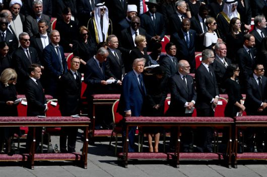 한편 이날 트럼프 대통령의 자리는 교황청 의전 규칙에 따라 세 번째 줄로 예상됐으나, 맨 앞줄에 위치해 이목을 끌었다. 유로뉴스는 외교 언어인 불어 알파벳 표기 순으로 자리를 배치하는 것이 의전 관례이나, 교황청이 전통을 깨고 막판에 자리 배치를 변경했다고 설명했다.