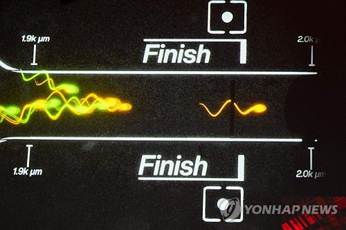 실험실 가운을 입은 한 남성이 미리 채취한 정액 샘플을 폭 2㎜의 '트랙'에 놓으면서 경주가 시작됐다.