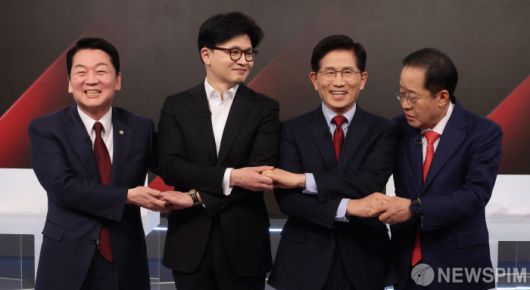 [서울=뉴스핌] 국회사진취재단 = 26일 서울 중구 매경미디어센터에서 열린 국민의힘 대통령 선거 제2차 경선 후보자 토론회에서 후보들이 기념 촬영을 위해 손을 맞잡고 있다. 왼쪽부터 안철수, 한동훈, 김문수, 홍준표 후보. 2025.04.26 photo@newspim.com |
