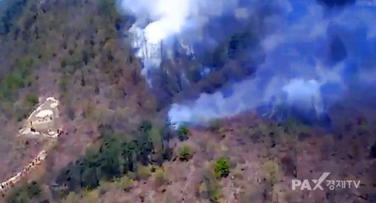 청송군 부남면 양숙리 산불헬기 영상 캡처. [사진제공=산림청][대전=팍스경제TV] 오늘(27일) 오전 9시 57분께 경상북도 청송군 부남면 양숙리 산255-3 일원에서 발생한 산불이 약 1시간 45분 만에 진화됐습니다.
