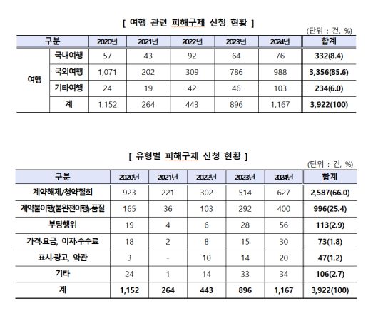 연도별로 보면 2020년 1152건에 달했던 여행관련 피해건수는 코로나19 여파로 2021년에는 264건으로 급감했지만 2022년 443건, 2023년 896건, 지난해 1167건 등으로 증가하는 추세다.