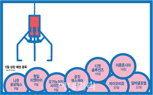 공모 일정 역시 몰리고 있다. 이달 마지막 한 주(4월 28일~5월2일) 동안 수요예측을 진행하는 기업만 4개 종목이고, 5월 들어서도 공휴일(5~6일)로 짧은 첫째 주 한 주간 수요예측과 청약을 진행하는 기업이 각각 3개씩이다. 5월 둘째주(12~16일) 역시 하루에 한 개 꼴로 총 4개 기업이 청약을 진행한다.