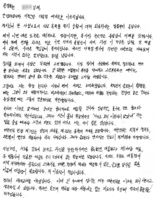 이 후보는 손편지에서 “대한민국은 더 이상 시간을 허비할 여유가 없다”며 “논리와 이성, 과학과 효율에 기반한 정치로 국가를 근본적으로 재설계하겠다”고 했다. 그는 “정치의 세대교체를 이루겠다”며 “혼란의 변곡점 마다 세상에는 젊은 지도자가 등장해 역사의 물줄기를 바꾸었다”고 말했다. 그러면서 에마뉘엘 마크롱 프랑스 대통령, 영국 토니 블레어 총리, 미국 오바마·케네디 대통령 등을 예시로 들었다.