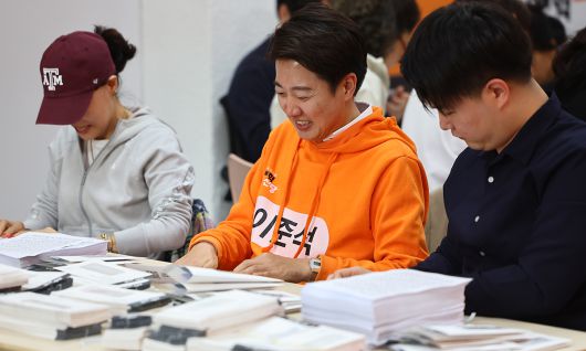 개혁신당 이준석 대선후보가 27일 서울 강남구에 마련된 선거캠프에서 손편지 홍보물 봉입 행사 '이준석과 함께-편지로 정치를 바꾼다'에 참석해 유권자들에게 보낼 손편지를 봉입하고 있다. 연합뉴스 |