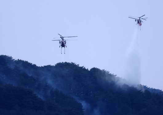27일 강원 인제군 상남면 하남리 인근 야산에서 산불 진화 헬기가 분주하게 진화 작업을 펼치고 있다. 연합뉴스 |