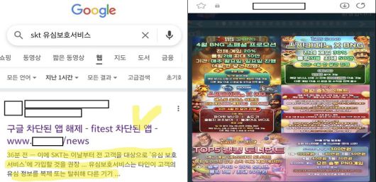 발견된 사례는 검색 사이트에 “유심 무상 교체” “유심보호서비스” 등의 키워드를 입력했을 때 나오는 검색 결과를 악용했다. 언론보도를 발췌·삽입한 검색 결과를 클릭하면, 중간 경유 도메인을 거쳐 최종적으로 도박사이트로 연결되는 방식이다.