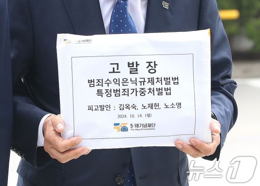 5·18기념재단 관계자가 14일 오전 서울 서초구 대검찰청에서 김옥순·노재헌·노소영을 상대로 노태우 일가 범죄수익은닉규제처벌법 및 특정범죄가중처벌법 위반 고발장 제출을 위해 이동하고 있다. 2024.10.14/뉴스1 ⓒ News1 임세영 기자 |