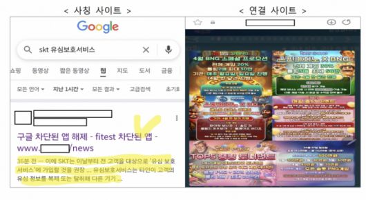 과기정통부와 KISA는 이날 '유심 무상교체' '유심보호서비스' 등 키워드를 입력하면 언론보도 일부를 발췌·삽입한 검색 결과를 노출시키는 페이지 등을 확인했다. 일반 국민이 이 페이지의 검색 결과를 클릭하면 중간 경유용 비영리 도메인을 거쳐 최종적으로 도박 사이트로 연결되도록 만들어졌다.