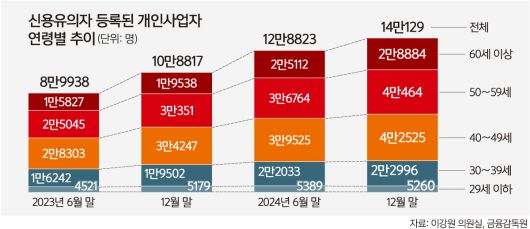 27일 국회 정무위원회 소속 더불어민주당 이강일 의원실이 금융감독원에서 제출받은 개인사업자(자영업자·기업대출을 보유한 개인) 대출 현황에 따르면, 작년 말 기준 한국신용정보원에 신용유의자로 등록된 개인사업자는 14만129명으로 집계됐다. 이는 1년 전인 2023년 말(10만8817명) 대비 28.8%(3만1312명) 늘어난 수치다.