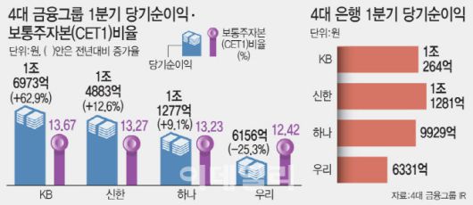 [이데일리 김나경 기자] 4대 금융그룹이 견조한 이자이익에 힘입어 올 1분기에만 약 5조원의 당기순이익을 기록했다. KB·신한·하나금융은 1분기 기준 ‘역대 최고실적’ 기록을 갈아 치웠다. 핵심 계열사 은행은 신한은행이 1분기에만 1조 3000억원 가까이 벌면서 ‘리딩뱅크’ 왕좌에 올랐다. 내수부진과 고환율·고금리로 차주들의 상환능력이 떨어지면서 각 금융그룹 건전성 지표는 일제히 하락한 것으로 나타났다.