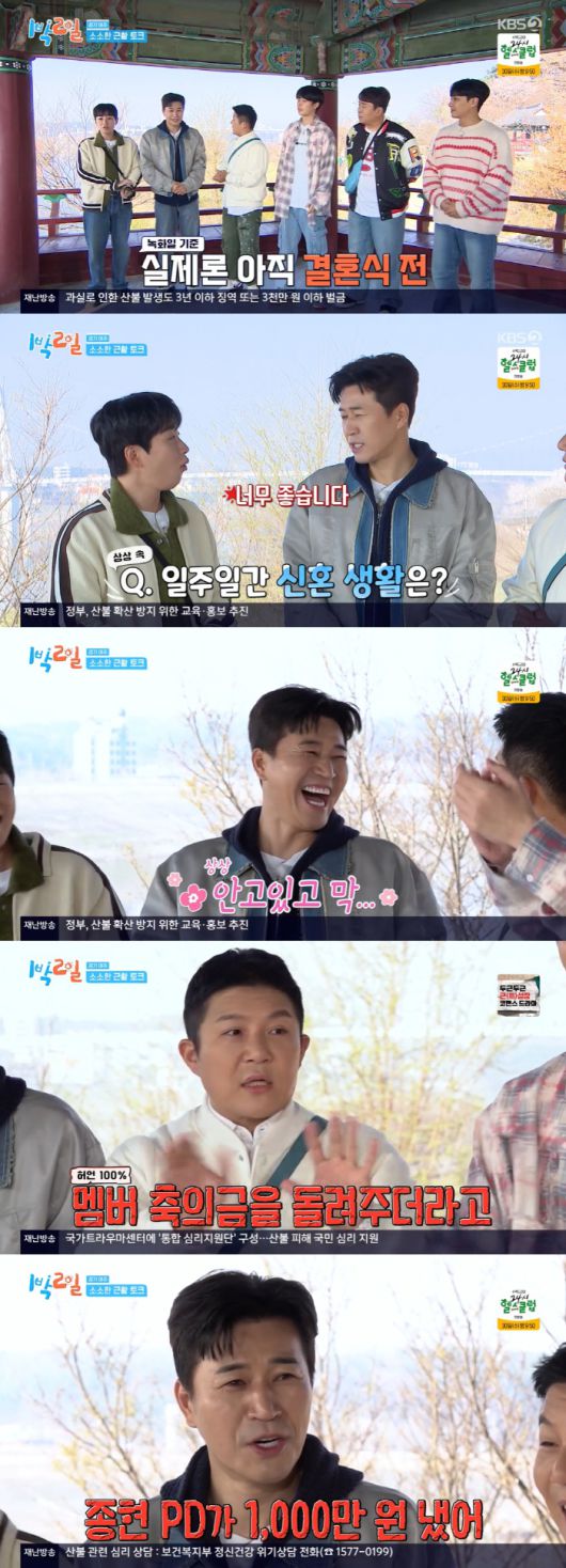 김종민은 지난 4월 20일 결혼식을 올렸던 바. 녹화 당일은 결혼식 전이었지만 방송은 결혼식 후 전파를 탈 것임을 고려, 김종민은 "많은 분들이 너무 축하해 주셔서 감사하다"라고 인사했다. 이어 한술 더 떠 "너무 좋다. 아내랑 안고 있고 그런다"라며 너스레를 떨어 웃음을 자아냈다.