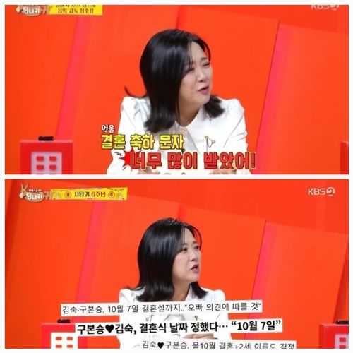 27일 방송된 KBS 2TV 예능 ‘사장님 귀는 당나귀 귀’에서는 김숙이 최근 불거진 결혼설을 언급했다. 김숙은 “사당귀 때문에 결혼 기사가 났다”며 “심지어 매니저가 ‘10월 7일 스케줄 비워야 하냐’고 물어봤다”고 밝혀 폭소를 자아냈다.