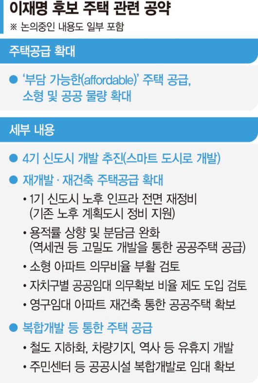 27일 정치권과 업계에 따르면 이 후보의 공급 정책이 소형 및 공공물량 확대에 초점이 맞춰질 것으로 보이는 데다 정비 사업 규제완화도 민주당의 그간 정책노선을 고려해 볼 때 한계가 있을 수 있다는 분석이다.