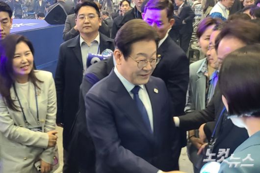 본 행사 시작 30분 전에는 행사장을 가득 메운 환호성이 울려퍼졌다. 이 후보가 잠시 행사장에 모습을 드러냈기 때문이다. 그는 삼엄한 경호를 받으면서도 행사장을 한 바퀴 돌며 "이재명"을 연호하는 지지자들과 악수를 나눴다.
