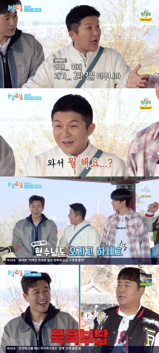 그런 조세호를 향해 "와이프도 '1박 2일'에 데려오는 건 어떠냐"는 제안이 이어졌다. 조세호는 "오는 건 되는데 와서 뭐 하냐"라며 당황했고, 이에 동생들은 최근 결혼한 김종민과 일찌감치 가정을 꾸린 문세윤까지 가리키며 "형수님들 오시면 어떠냐", "와이프 특집 하자"라며 기대감을 높였다.