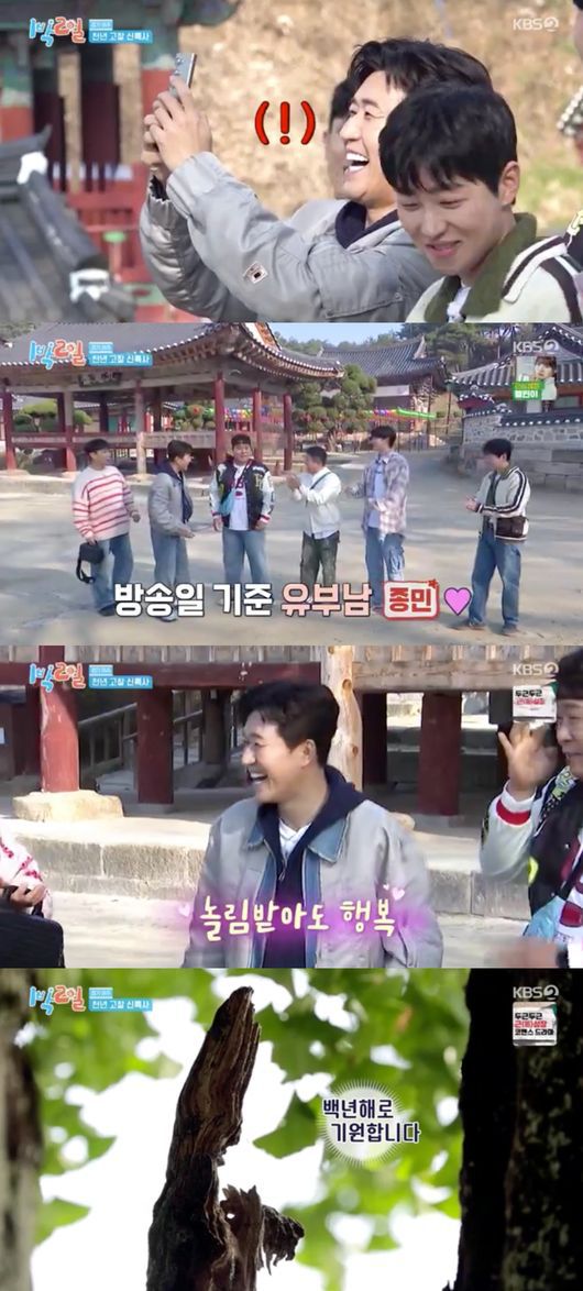 김종민이 자연스럽게 핸드폰을 들어 풍경을 찍자, 이를 본 문세윤이 "'자기야 나 여기 왔다'라고 말하려고!"라며 김종민을 놀렸다. 부끄러워 하는 김종민의 모습에 동생들은 앞다퉈 맏형을 놀렸다. 녹화일로는 아직 남았으나 방송일 기준 지난 20일 진행된 김종민의 결혼식 이후 첫 방송이었던 터. 이에 동생들은 "자기랑 결혼하고 첫 촬영이야!"라고 입을 모아 훈훈함을 자아냈다.