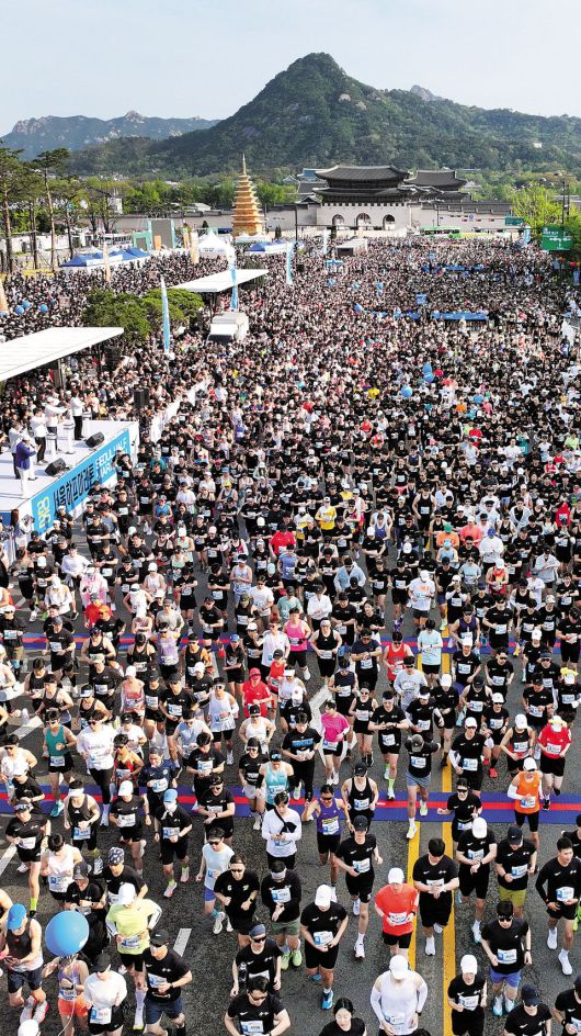 27일 아침, 부산에서 올라온 강경애(54)씨는 광화문광장에 발을 디뎠다. 봄볕에 색색으로 빛나는 깃발들 사이를 큰아들 김도영(27)씨와 팔짱을 끼고 걸었다. “서울 참 좋다.” 강씨가 말했다. “이런 날 아들이랑 러닝 데이트라니.” 그는 2025 서울하프마라톤(조선일보·서울시·서울시체육회 공동 주최) 10km 부문 참가를 위해 이곳까지 왔다.