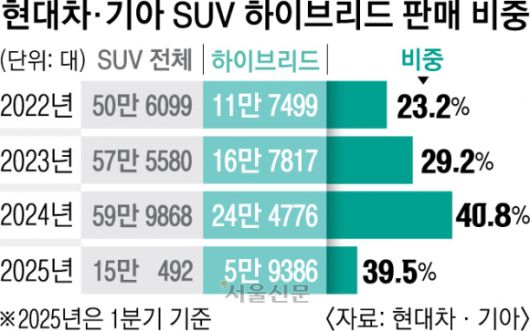 27일 현대차·기아에 따르면 올해 1분기 국내에서 팔린 현대차·기아의 SUV는 총 15만 492대로 집계됐다. 이 중 하이브리드 모델은 5만 9386대(39.5%)였다. 현대차·기아 하이브리드 SUV의 국내 판매량은 2022년 11만 7499대에서 지난해 24만 4776대로 2년 새 2배 가까이 늘었다. 같은 기간 전체 SUV 중 하이브리드 비중도 23.2%에서 40.8%로 껑충 뛰었다.