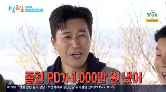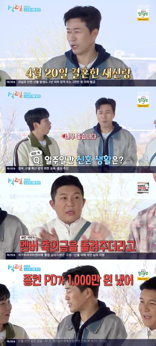 그러나 '1박 2일' 원년 멤버 김종민은 당하고만 있지 않았다. 오히려 그는 "축의금 돌려줘도 괜찮은 게, 제작진이 제일 많이 냈다. 종현이(PD) 한 1천만원 정도 냈다. 깜짝 놀랐다. 진정한 대인배다. 오늘부터 '천종현'이다"라고 너스레를 떨었다. 이에 졸지에 '1박 2일' 제작진이 거금의 축의금을 낸 것처럼 마무리돼 웃음을 더했다.