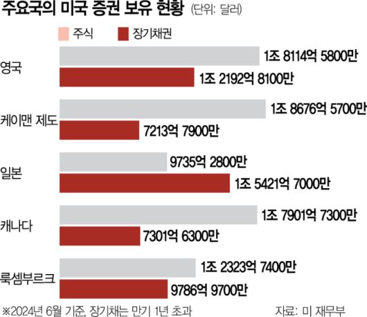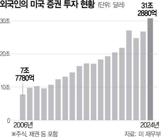 이렇게 자금 공급(저축)이 자금 수요(투자)를 충족하지 못하면 해외에서 자금을 충당한다고 말씀드린 적이 있는데요. 이를 잘 보여주는 것이 아래 그림입니다. 외국인이 미국 증권(주식, 채권 등)을 얼마나 사들였는지를 나타낸 것입니다. 외국인들이 미국 증권을 사들인 규모는 2006년 7조 7780억 달러에서 2023년 26조 8720억 달러로 불어났습니다.