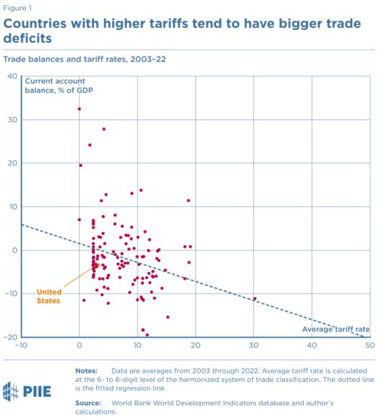아래 그림은 미국 피터슨 국제경제연구소가 무역적자 규모와 관세율 관계를 분석한 그림입니다.