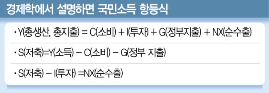 설명은 이렇습니다. (불가피하게 수학적 표현이 다소 들어갑니다.) 한 나라의 거시경제를 파악할 때 우리는 국내총생산(GDP)이라는 지표를 사용합니다. GDP는 소비(C), 투자(I), 정부지출(G), 순수출(NX)로 나뉩니다. 한 나라의 총생산·총소득·총지출(GDP)은 소비자, 기업, 정부라는 경제주체들의 지출과 해외 부분 총합이라는 의미입니다. 경제학 용어를 쓰면 국민소득항등식(Y=C+I+G+NX)입니다. 다만 여기서는 쉽게 ‘1번 방정식’이라고 지칭하겠습니다.