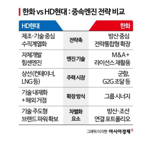 다만 접근 방향은 극명히 갈린다. HD현대가 조선·엔진·기자재까지 수직계열화를 이뤄 기술력과 원가경쟁력을 앞세운 반면 한화는 방산과 연결된 전략통합형 포트폴리오로 맞서게 된다. 엔진 제조에서 군함 조선, 무장체계까지 한 그룹 안에서 연결되는 구조다. 이는 정부는 물론 해외 정부 조달시장, 특히 미국 국방조달(G2G) 사업에서도 강력한 장점으로 작용할 수 있다. 결국 한화의 중속엔진 사업 복귀는 단순 조선기계 부문 확대를 넘어 '조선 기반의 글로벌 방산 그룹'이라는 청사진을 위한 핵심 퍼즐이 될 전망이다.