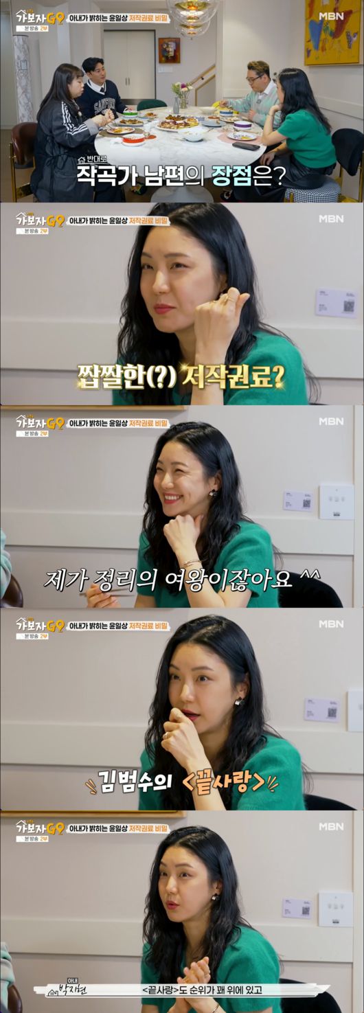 작곡가 남편의 장점에 대해 와이프는 “저작권료”라고 솔직하게 말해 웃음을 안겼다. 윤일상은 달마다 저작권료가 다르다고 밝혔고, 아내가 저작권료를 전적으로 관리하고 있다고 말했다.