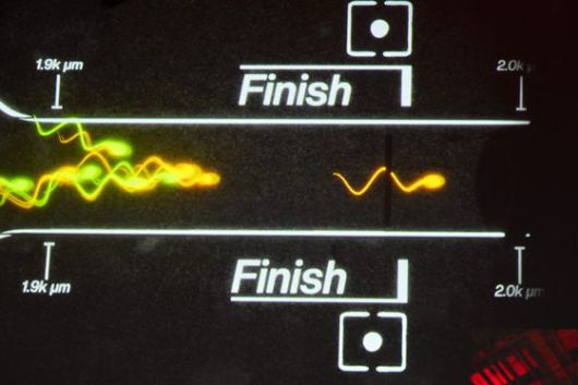 이와 관련해 실험실 가운을 입은 한 남성이 미리 채취한 정액 샘플을 폭 2㎜의 트랙에 놓으면서 경주가 시작됐다.