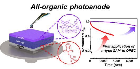 연구팀은 n형 자가조립 단분자막(SAM)과 p형 고분자 전해질층을 이용한 전 유기물 광전극을 개발해 이 문제를 해결했다.