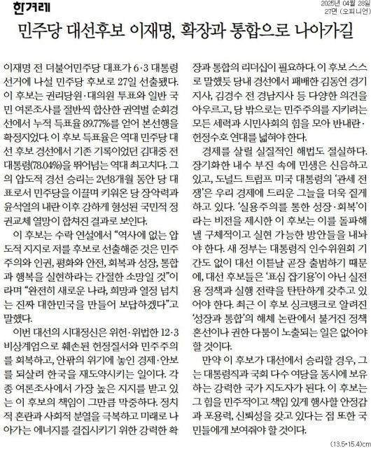 한겨레 = 민주당 대선후보 이재명, 확장과 통합으로 나아가길
