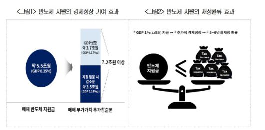 경제효과 분석을 수행한 고려대 경제연구소를 대표해 발표에 나선 김덕파 교수는 “정부가 반도체에 실질 GDP 0.25%(5조 5000억원 수준)를 매년 지원하면 연간 성장률이 매년 0.17%포인트(약 3조 7000억원)씩 성장한다”며 “지원이 없을 경우 연구개발(R&D) 투자 감소 등으로 연간성장률이 매년 0.16%포인트(약 3조 5000억원)씩 감소하게 되는 것을 고려하면, GDP에 기여하는 실질 효과는 매년 7조 2000억원 이상”이라고 강조했다. 부가가치 창출 효과가 큰 반도체산업에 대한 재정지출 효율성을 강조한 것이다.