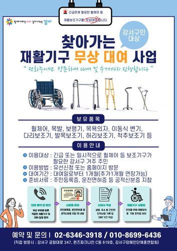 서울 강서구(구청장 진교훈)는 주민 편의를 위해 '찾아가는 재활보조기구 공유·나눔 서비스'를 운영한다고 밝혔다.