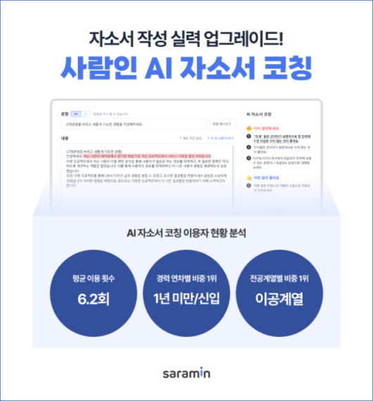 사람인은 지난해 4월부터 올해 2월까지 ‘사람인 AI 자소서(자기소개서) 코칭’ 서비스 이용 현황을 28일 발표했다. 사람인이 지난 2022년 선보인 AI 자소서 코칭은 구직자의 자기소개서를 AI가 분석해 문맥, 표현, 단어 등 다양한 부분의 개선점을 제안하는 서비스다. 자연어처리(NLP) 분석 알고리즘에 기반해 키워드나 맞춤법 검사 등 기초적 범위를 넘어, 글의 맥락을 이해하고 진부한 표현까지 체크해 알려준다.