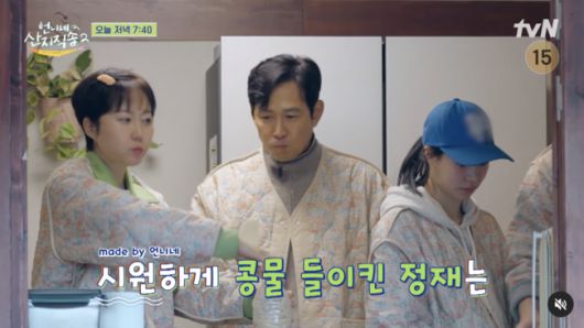 새로운 식구 이정재와 함께 돌담 마을로 복귀한 사 남매는 본격적인 저녁 밥상 준비에 돌입했다. 저녁 메뉴는 황태 양념구이와 시래기 감자탕. 염정아의 진두지휘하에 박준면이 시래기 삶기, 임지연이 수제비 반죽, 이재욱이 불피우기를 담당했고, 이정재는 깔깔이룩으로 환복한 뒤 감자 까는 일을 도맡았다. 이정재는 감자 지옥에 빠진 상황에서도 페트병 분리 수거부터 설거지까지 묵묵히 뒷정리를 마치며 남다른 깔끔함을 자랑했다.