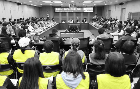 그날 내게 인상 깊었던 건 의원회관 세미나실을 가득 메운 50대 여성들이었다. 노란 조끼를 입고 모인 이들은 피해당사자 증언대회라는 이름이 무색하게 하하 호호 반갑게 서로의 안부를 물었다. 중장년 여성들이 이렇게 많이 모인 걸 본 게 언제였을까 싶다가도 이들이 계산, 진열 업무 등을 하며 마트 운영을 떠받치고도 하루아침에 자본의 피해자가 될 수밖에 없었다는 것에 한숨이 나왔다.