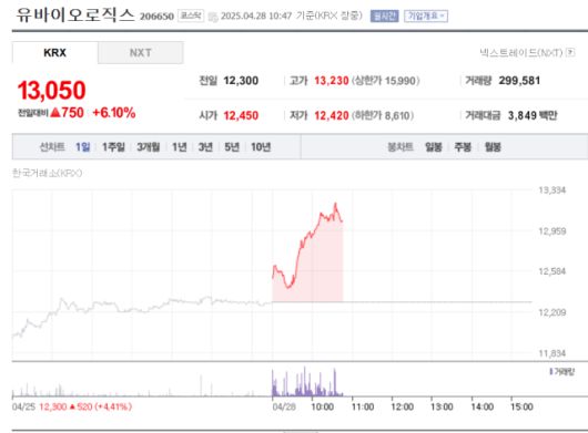28일 오전 유바이오로직스 주가는 전 거래일 대비 6.10%(750원) 이상 상승세를 보이며 강세를 이어가고 있다.