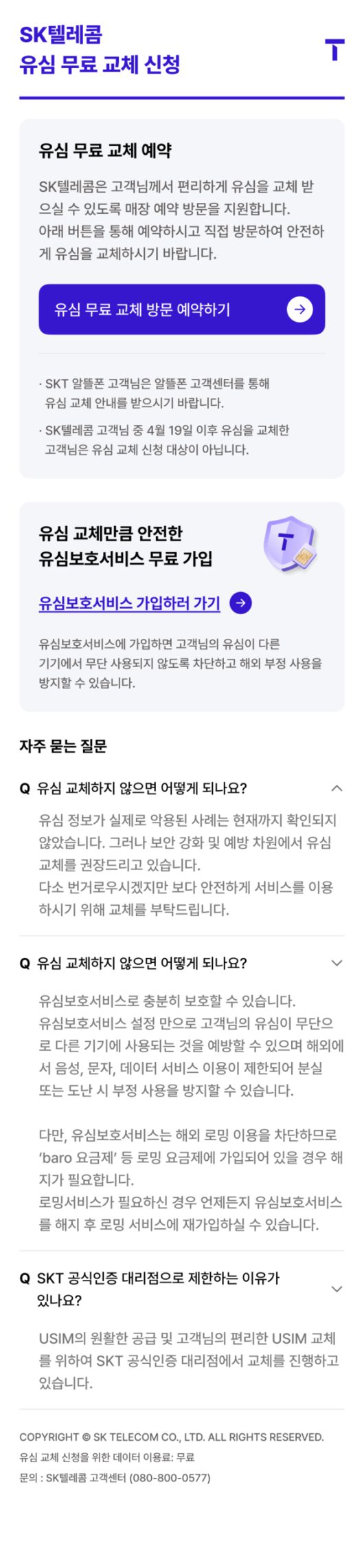 이를 위해 28일 오전10시부터 전국 2600여 곳의 T월드 매장에서 희망하는 고객들을 대상으로 유심 교체를 무료로 진행할 예정이다. 2025년 4월 18일 24시 이전 SK텔레콤에 가입돼 있는 이동통신 고객들이 대상이다.