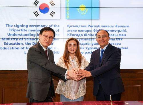 26일(현지시간) 카자흐스탄 아스타나시에 있는 유라시아국립대에서 열린 협약식에는 임태희 경기도교육감과 디나라 슈체글로바 과학고등교육부 장관 대행, 예를란 스드코프 유라시아국립대 총장 등이 참석했다.
