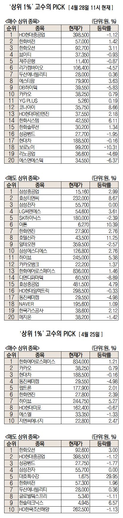 이날 미래에셋증권에 따르면 미래에셋증권 주식 거래 고객 중 최근 1개월간 투자수익률 상위 1%에 해당하는 ‘주식 초고수’들이 오전 11시까지 가장 많이 사들인 종목은 HD현대중공업이다.
