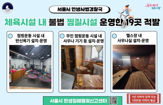 서울시 민생사법경찰국(이하 '민사국')은 목욕장업 영업 신고 없이 반신욕기 등을 설치하고 찜질 시설을 불법으로 운영한 체육시설 19곳을 적발했다고 28일 발표했다.