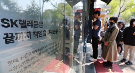 해킹 공격으로 가입자 유심 정보가 탈취된 SK텔레콤이 가입자 유심 무상 교체를 시작한 28일 오전 경기 수원시의 한 SK텔레콤 직영 매장 앞에 고객들이 줄지어 대기하고 있다. /사진=뉴스1 |