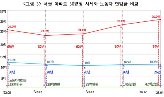 특히 노동자 평균임금 대비 아파트 구입 소요 기간을 산출해 양극화를 지적했다. 통계청 자료를 바탕으로 산출한 결과 올해 4월 기준 평균 임금을 받는 노동자가 강남의 30평 아파트를 매입하려면 74년간 한 푼도 쓰지 않고 저축해야 하는 것으로 나타났다. 3년 전인 2022년 5월에는 69년이었는데 오히려 5년이 늘어난 셈이다.