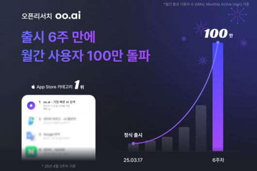 인공지능(AI) 검색 기업 오픈리서치의 AI 검색 플랫폼 '오오에이아이(oo.ai)' 월간활성사용자(MAU)가 100만명을 돌파했다.