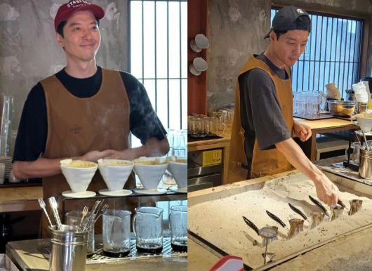 사진은 카페에 방문한 한 고객이 촬영해준 사진으로, 사진 속 이동건은 앞치마를 두르고 방문 고객을 향해 환한 미소를 짓고 있다.