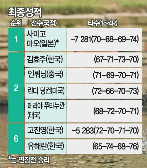 사이고는 일본여자프로골프(JLPGA) 투어에서 6승을 거두고 지난해 LPGA 투어에 진출한 선수. 첫해에 우승 없이 신인상을 탄 그는 2년 차에 데뷔 첫 우승을 메이저에서 해냈다. 일본 선수의 LPGA 투어 메이저 우승은 사이고가 역대 다섯 번째이고 셰브런 챔피언십 우승은 일본 최초다. 상금은 120만 달러(약 17억 2000만 원). 김효주는 50만 759달러(약 7억 2000만 원)를 벌었다.